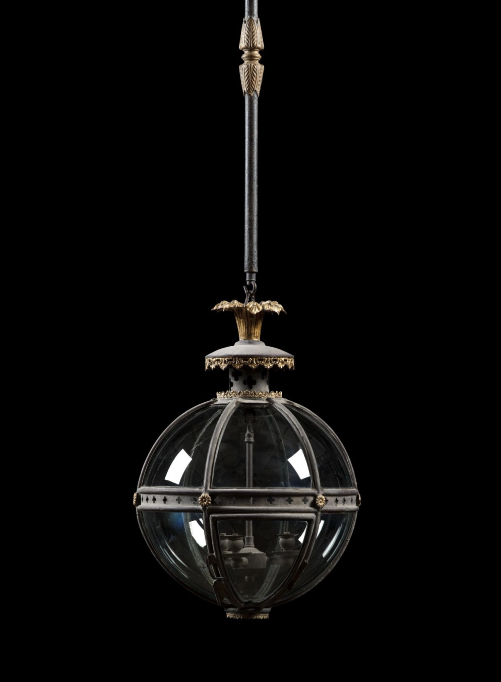 A small, spherical hanging lantern with a pierced and moulded meridian ring punctuated with gilt flower heads, the pierced top with gilded collars.