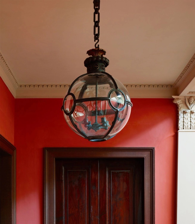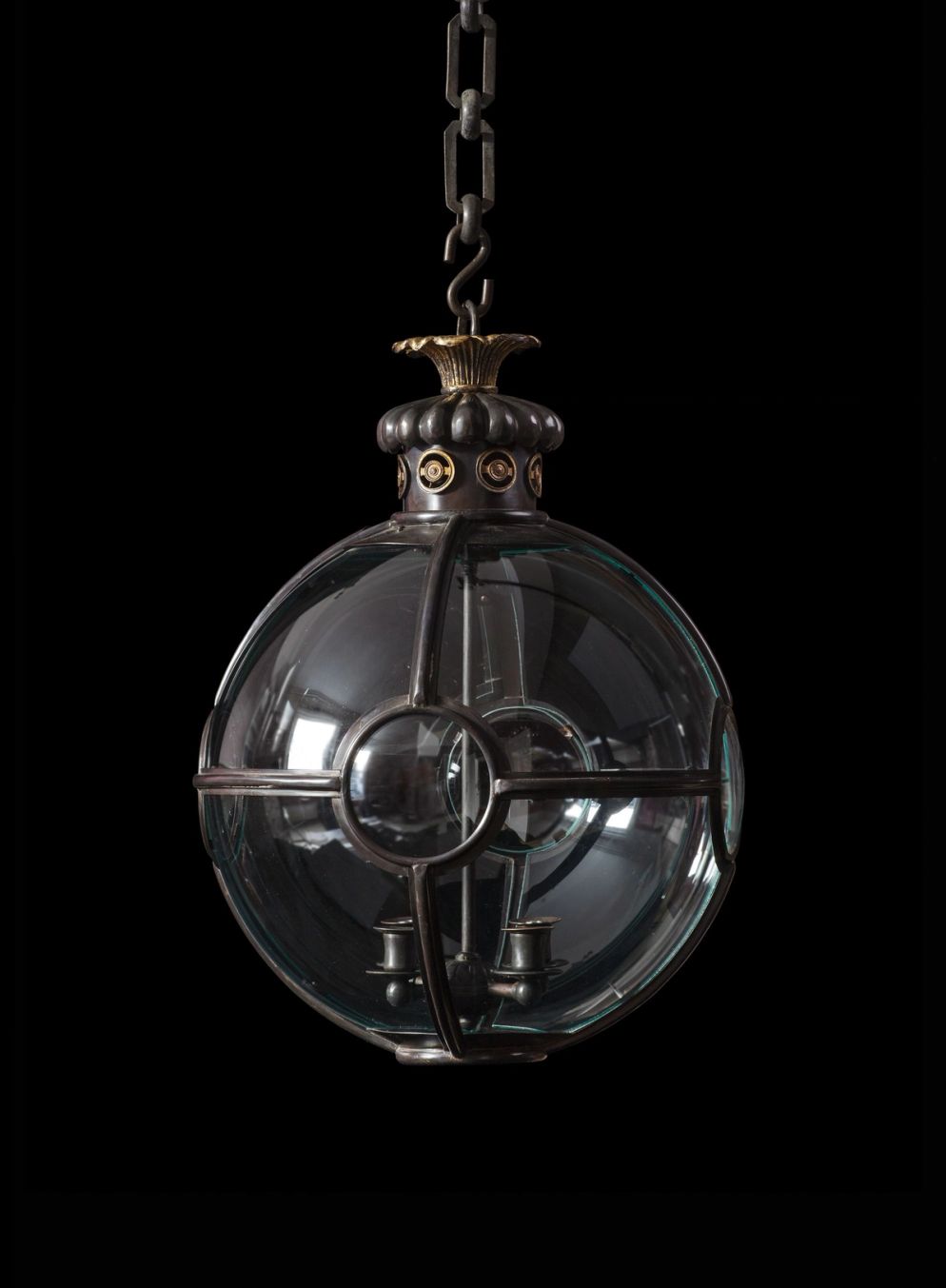 This fully glazed, spherical lantern with convex glass panels fitted around the meridian has a pierced heat duct, gadrooned decoration and a gilt leaf spray. The gilt brass elements add richness to the effect of electric or candle light.