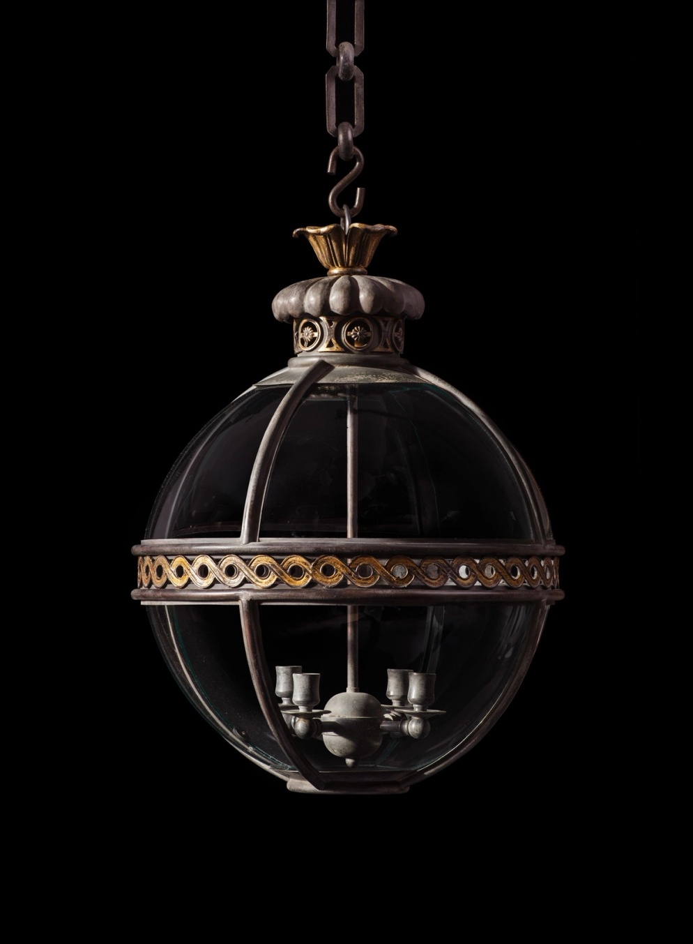 Each of the glass panes sit within bronze mouldings divided by a meridian band of pierced gilt brass guilloche. The gadroon-moulded chimney with flower head filled, gilt brass guilloche sits beneath a leaf cast rose.