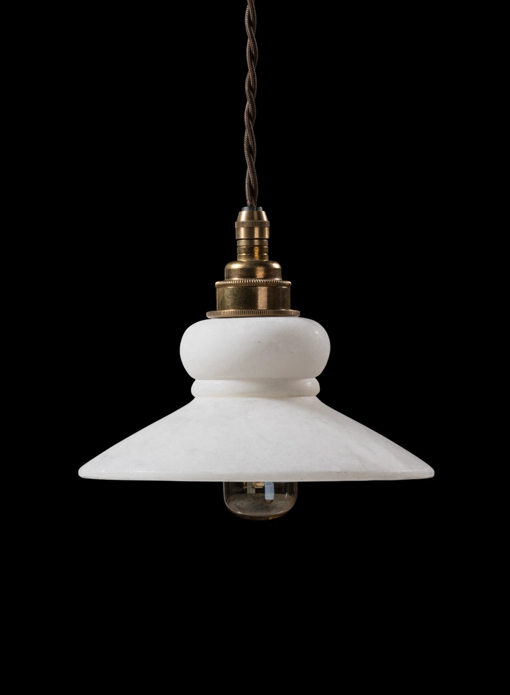 A shade of quiet simplicity, the Ada is turned from a single piece of alabaster, its cool translucence lending a soft, diffused light. The form is modest but purposeful: a flared profile with a rounded collar that recalls early electric fittings, refined through proportion and material.