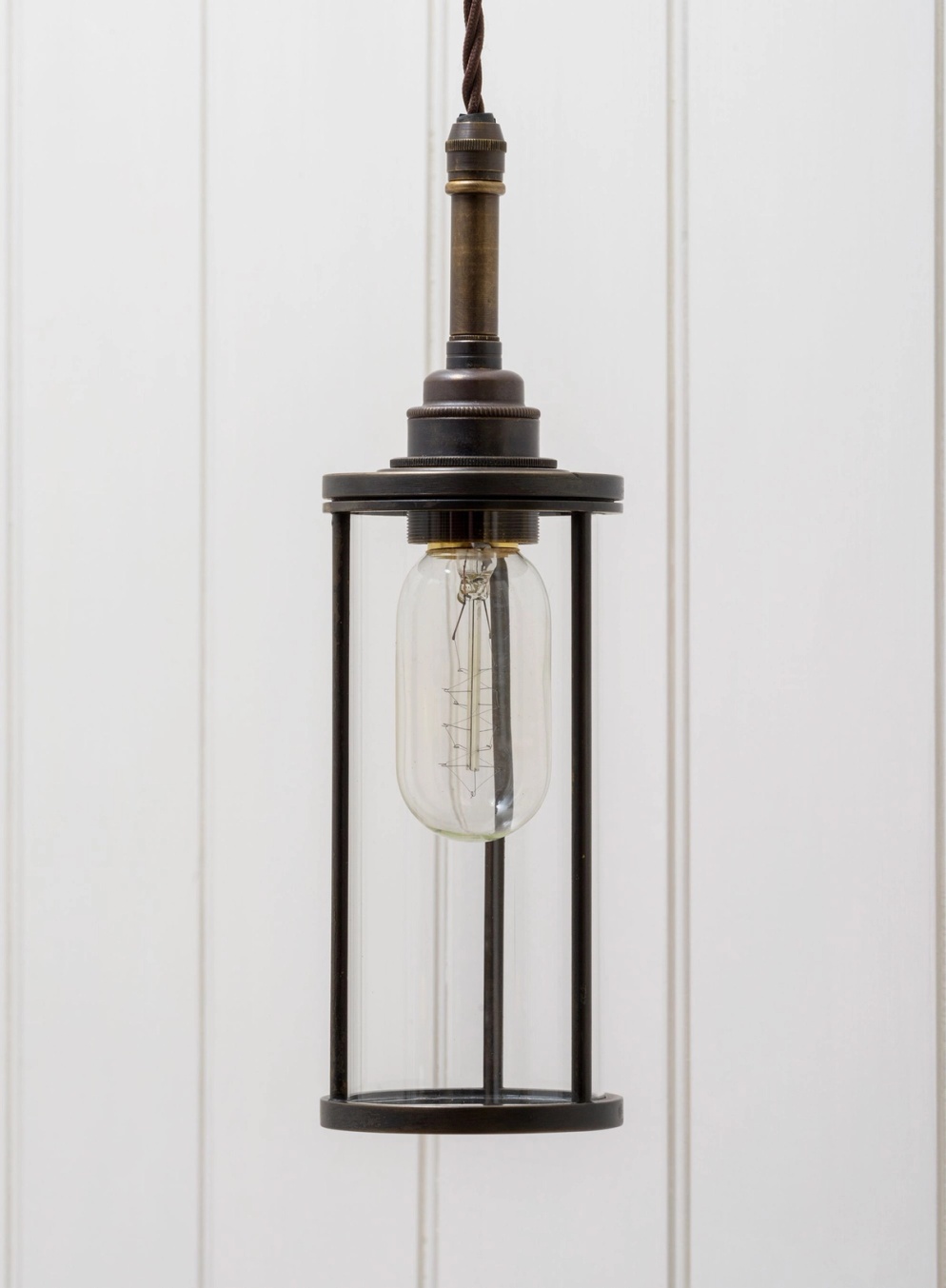 A cylindrical lantern, inspired by the 1920s industrial era. Supplied as standard with 1.5m of twisted cord flex, filament bulb, and small ceiling canopy finished to match.