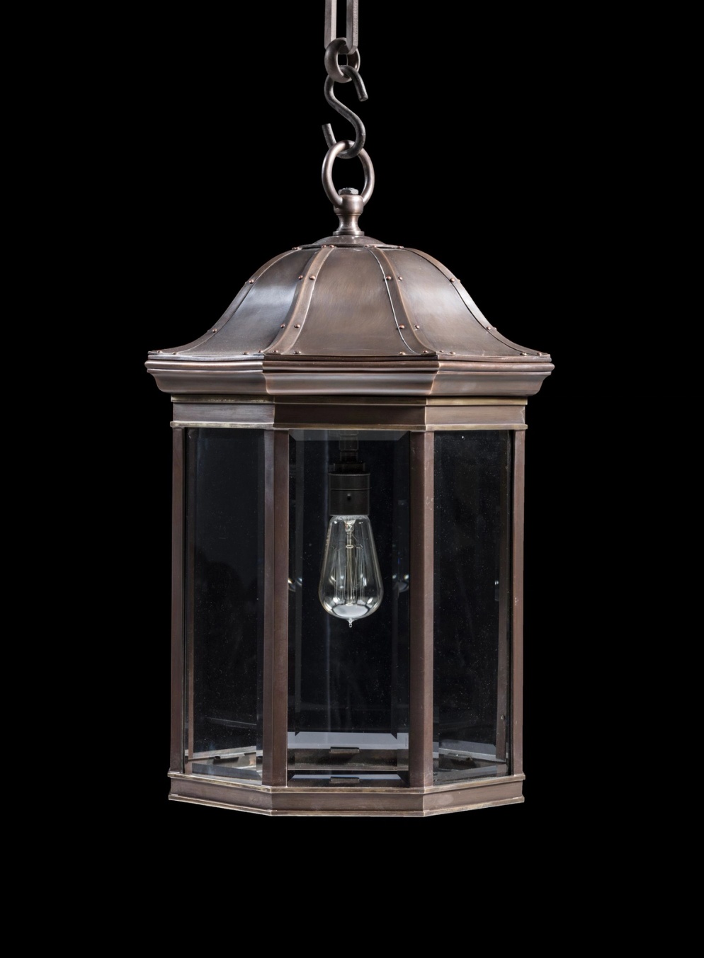 An Octagonal hanging lantern with gently sloping campana shaped roof above rectangular bevelled glazed sides. Surmounted by a central hanging hook on a ball and socle.