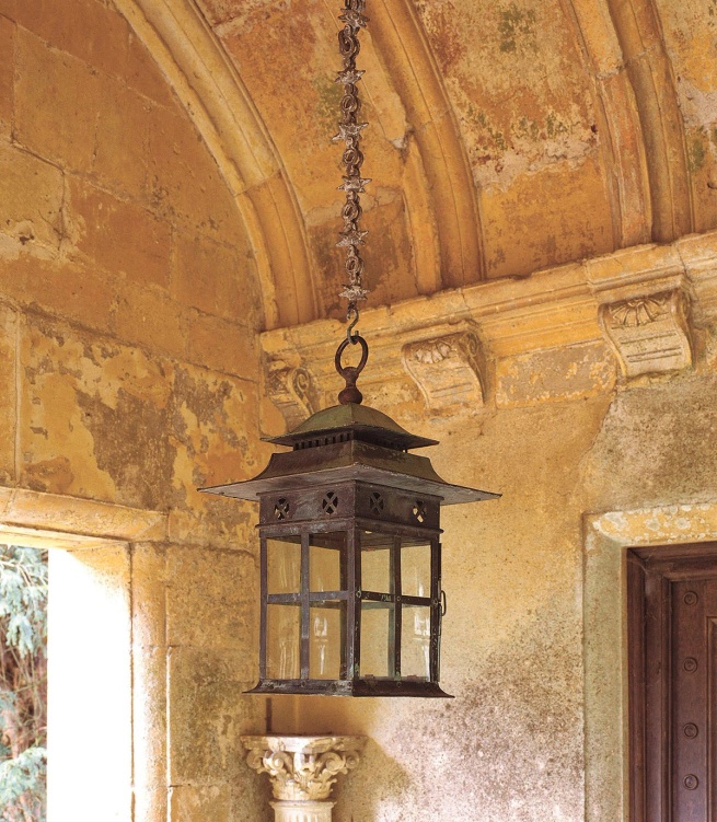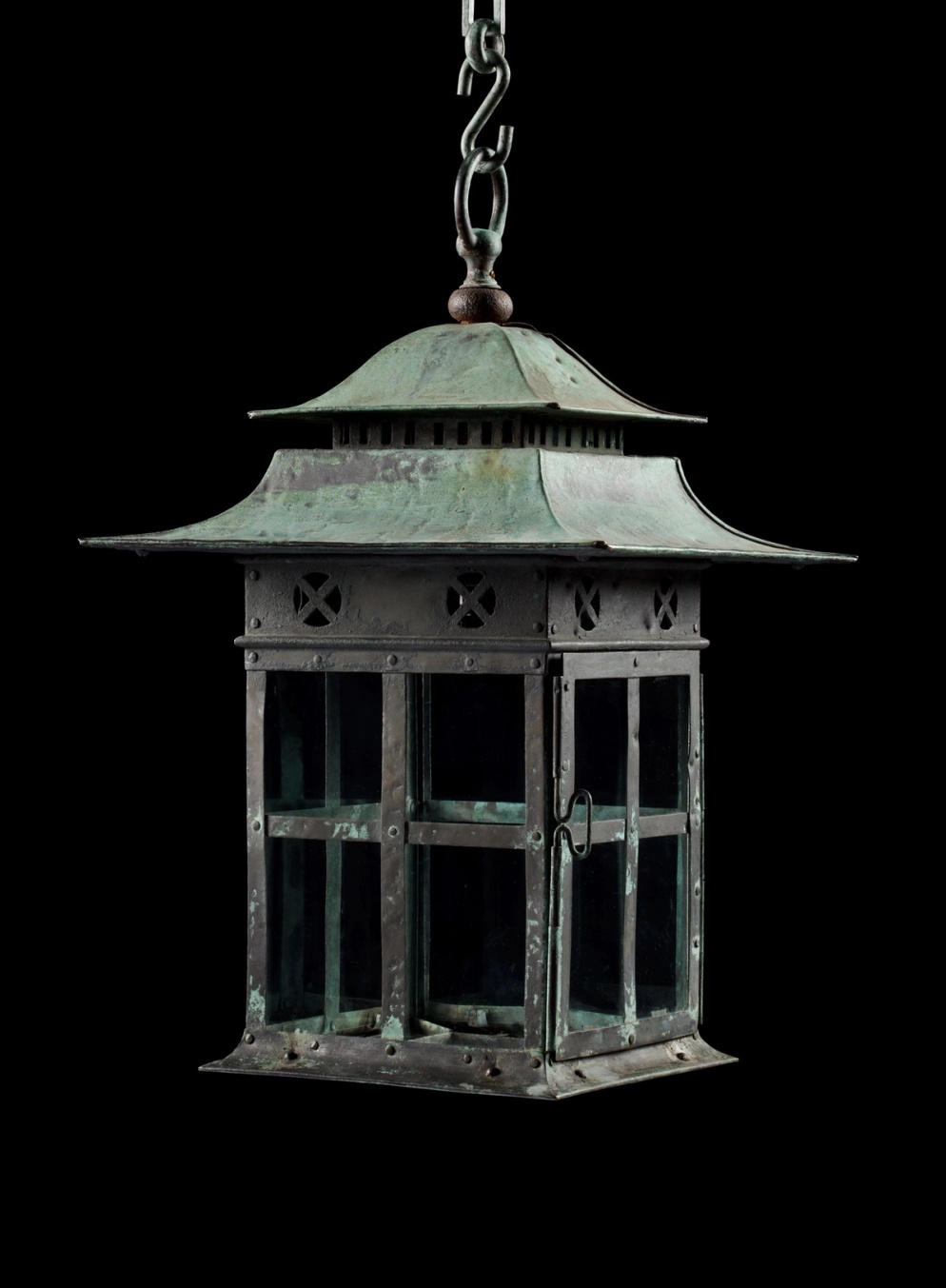 The double pagoda top of this verdigris copper lantern has pierced smoke outlets above the square sides, with pierced panels above.