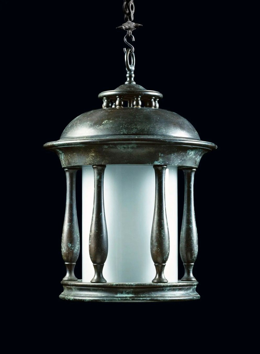 An elegant hanging lantern with six shaped pillars and a glass central cylinder.