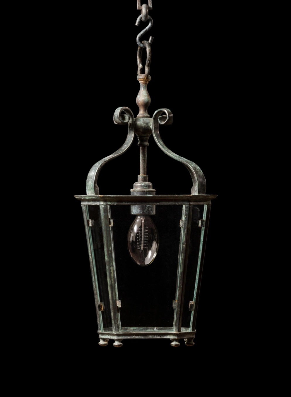 This classic octagonal lantern, inspired by both eighteenth and nineteenth-century design, features elegantly tapering glass panes beneath a scrolling top. Its timeless appearance and small proportions render it a handsome addition to any interior or exterior space.