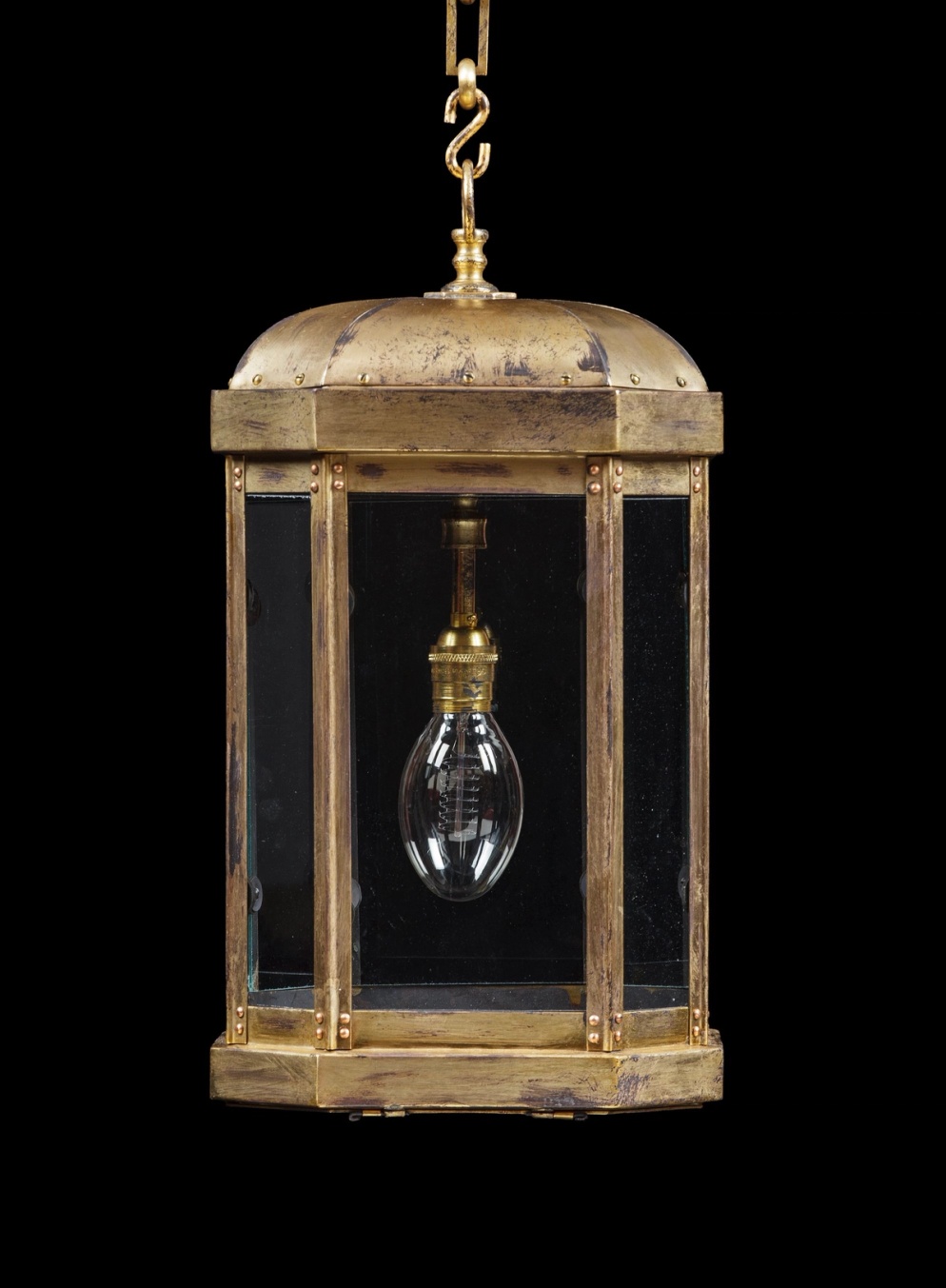 A patinated, octagonal hanging lantern in the Art Deco style, with canted corners, riveted domed top and moulded sides.