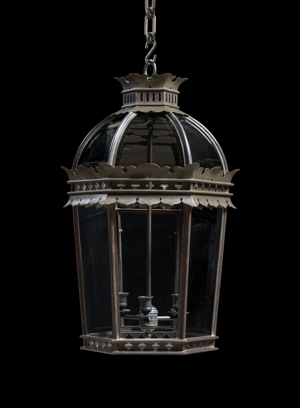 This tapered and moulded lantern inspired by Bridgens has a hinged side door beneath a running band of pierced gothic and Jacobean revival decoration, the glazed and domed top with a slotted cupola.