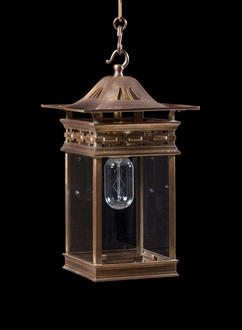 The single pagoda top of this hanging lantern has pierced smoke outlets running across the square sides. Delicately moulded copper buttons run above the three glass panels, encasing a single bulb.