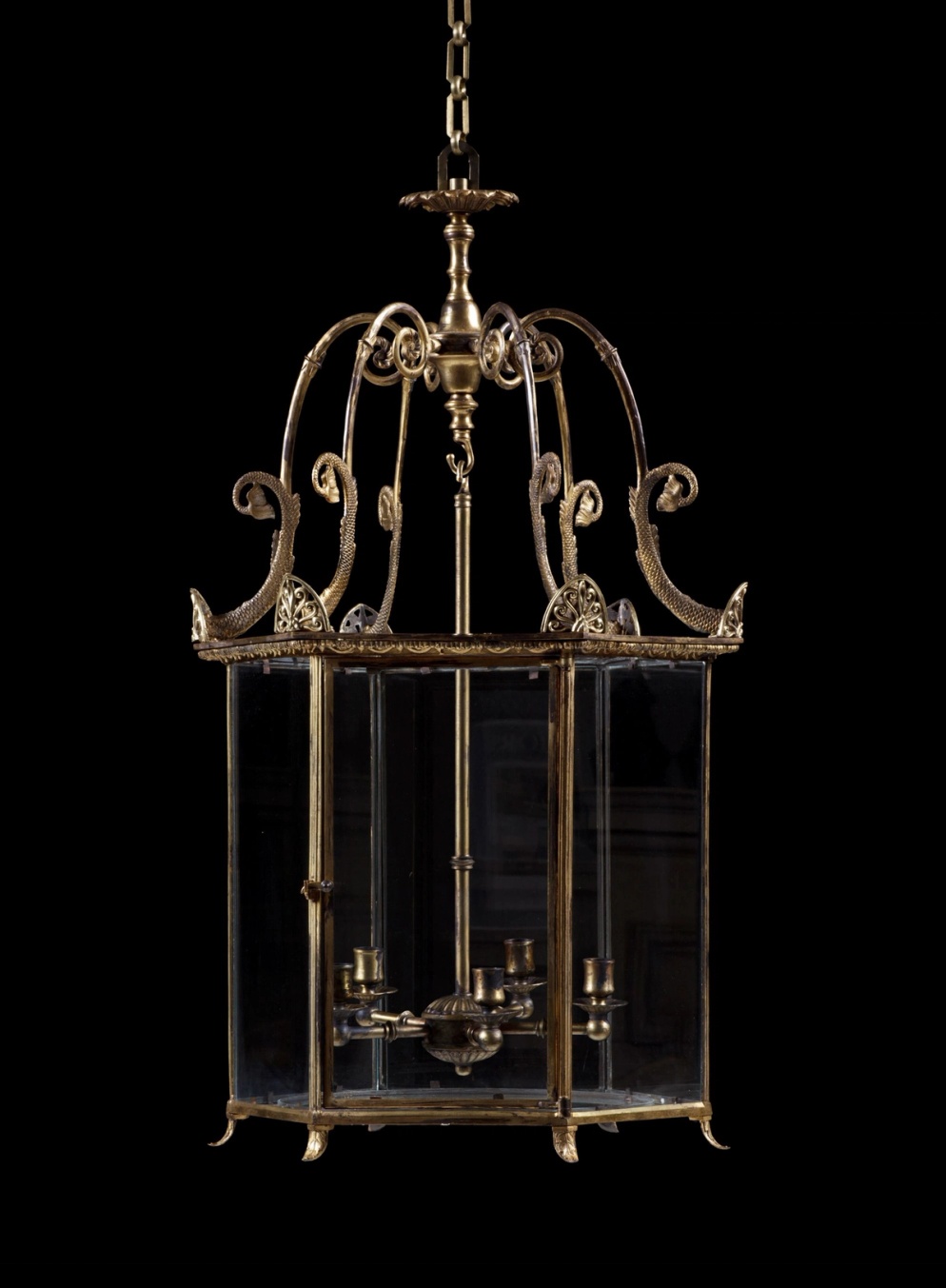A classical hexagonal brass lantern displaying the late Georgian period with double scrolling supports terminating in acroteria, the centre fitted with five candleholders and with cast feet to each corner.