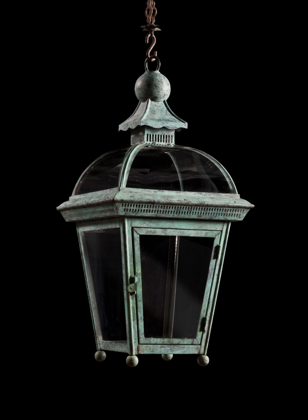 This elegant lantern with tapered glazed sides has unusual domed top panels beneath a ball finial and pagoda-shaped ventilator.
