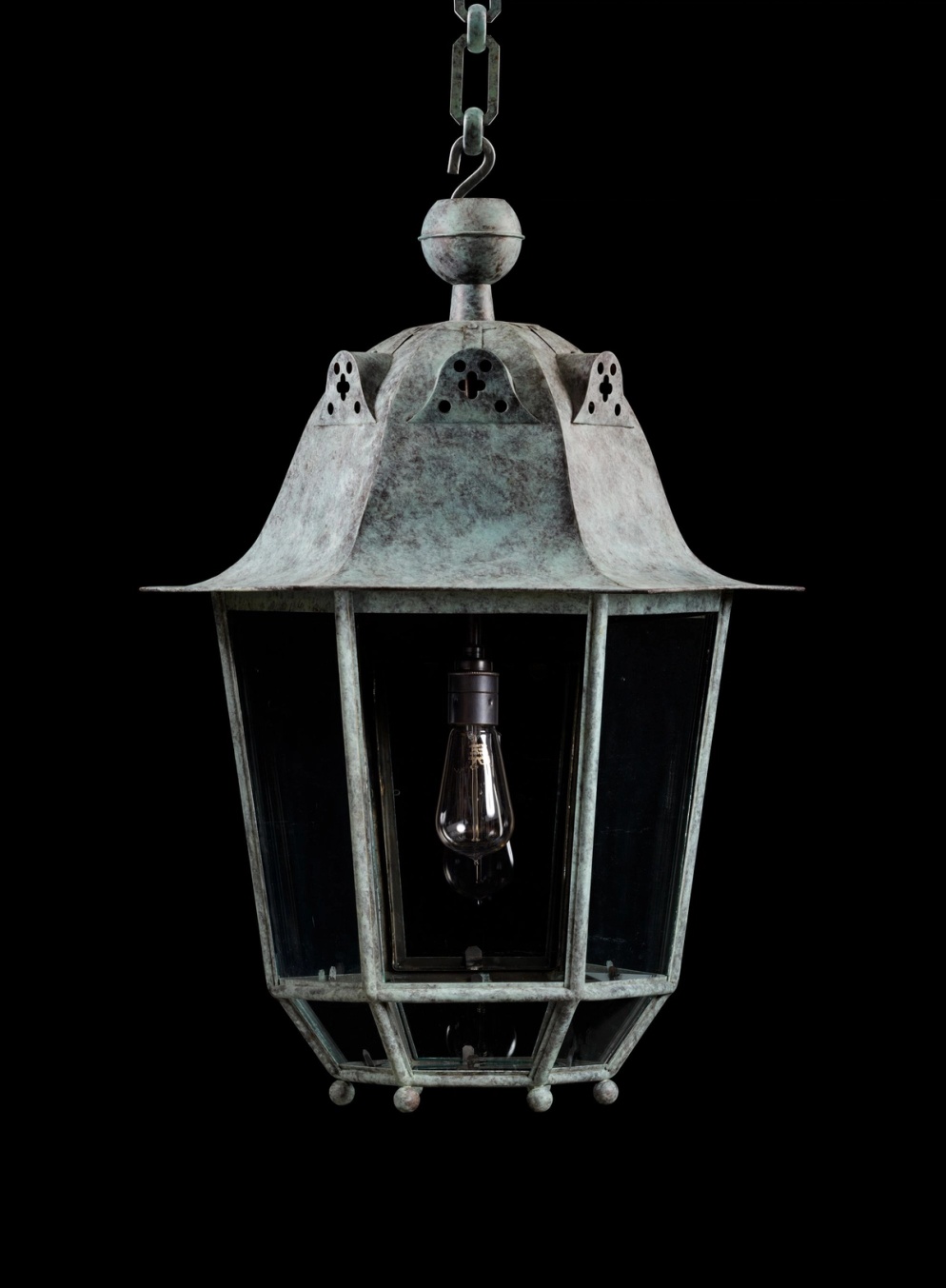 This elegant lantern has taken much of its design from the Arts and Crafts aesthetic movement. The campana hood hangs from a ball finial and pierced cupola, above a hexagonal glazed body with canted lower section on ball feet.