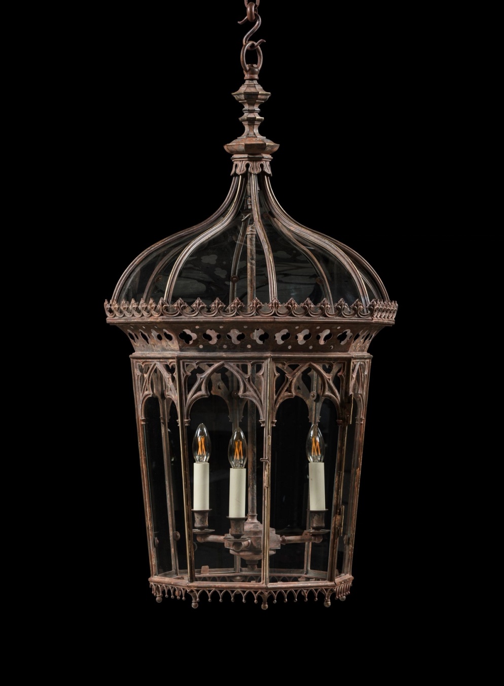 This striking gothic lantern features tapering sides with tall arches, pierced quatrefoils, and extruded brass ribs supporting a glass roof, reminiscent of cathedral ceilings.