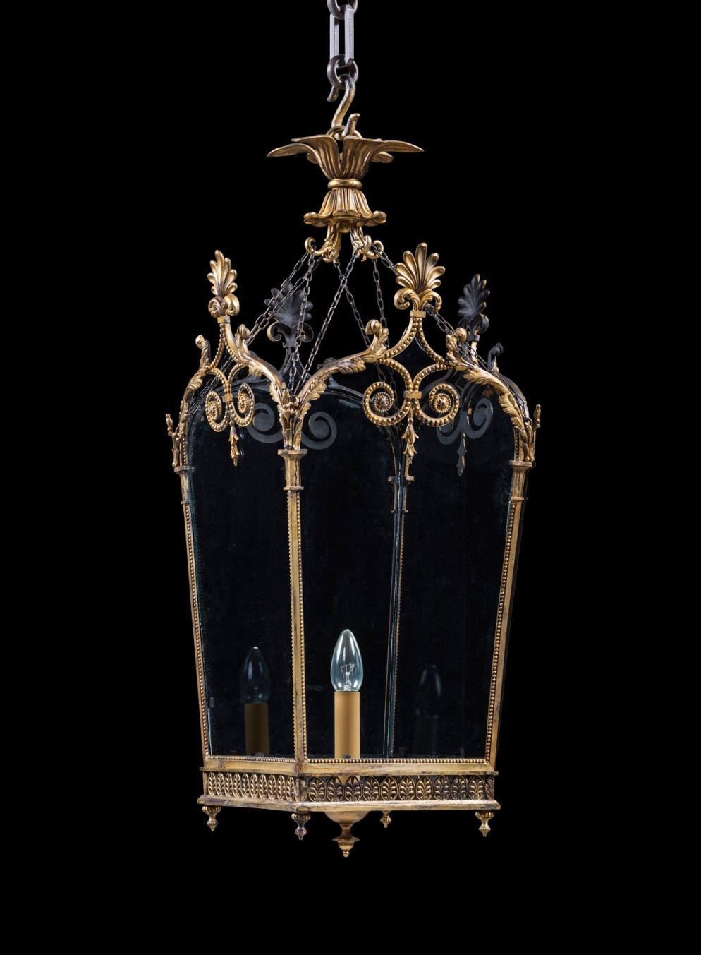 This elegant hanging George III style Gilt Brass hall lantern, the original of which was possibly supplied by Thomas Chippendale, c. 1775–90, is upheld by four chains hanging from a ceiling rose, the underneath is decorated with inverted finials.