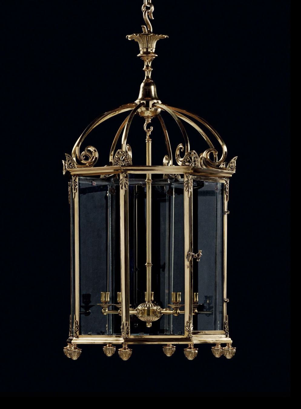 This classical octagonal Brass lantern displays all the design elements of the early nineteenth Century. Each of the glass panels is headed by Anthemion filled acroteria with cone finials at the base.