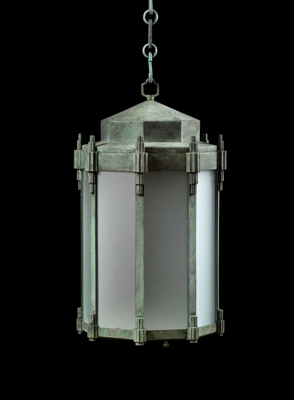 A patinated, octagonal hanging lantern in the Art Deco style with tapering octagonal cupola.