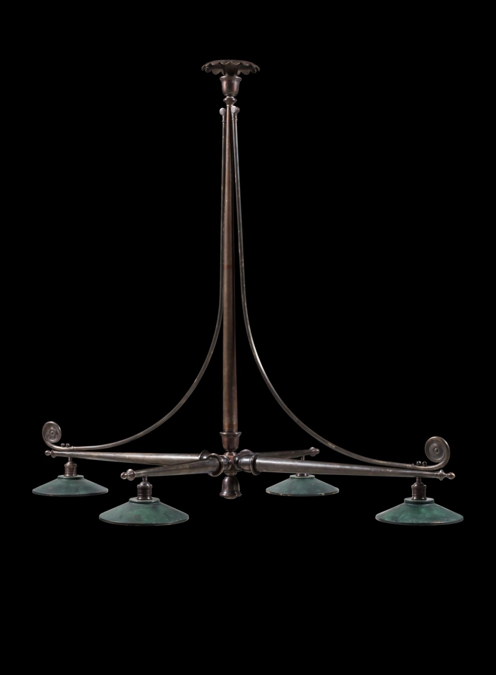The curved brass bars of this light fall from the canopy with easy grace and end in scrolls. This light, drawn from nineteenth-century gasolier design, comes with either a short central stem or a long central stem, depending on the overall drop required. Available in Long and Short drop.