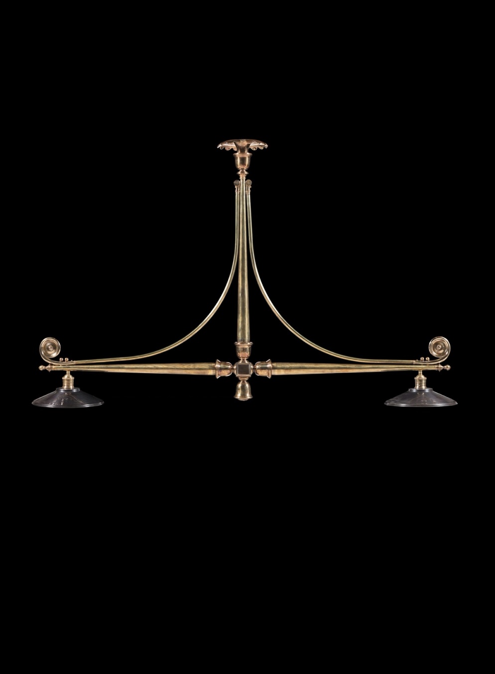 From the ceiling canopy, two brass bars sweep downwards in a highly elegant curve to meet the metal shades at either end of the horizontal bar. Refined and simple, this light can be ordered with either a short or long drop.