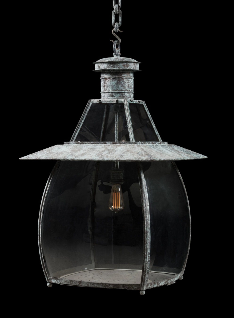 This hanging lantern, now made to grand scale, is based on an original English piece with an unmistakable American federal character. The hand formed bulbous glass is held within the brass frame.