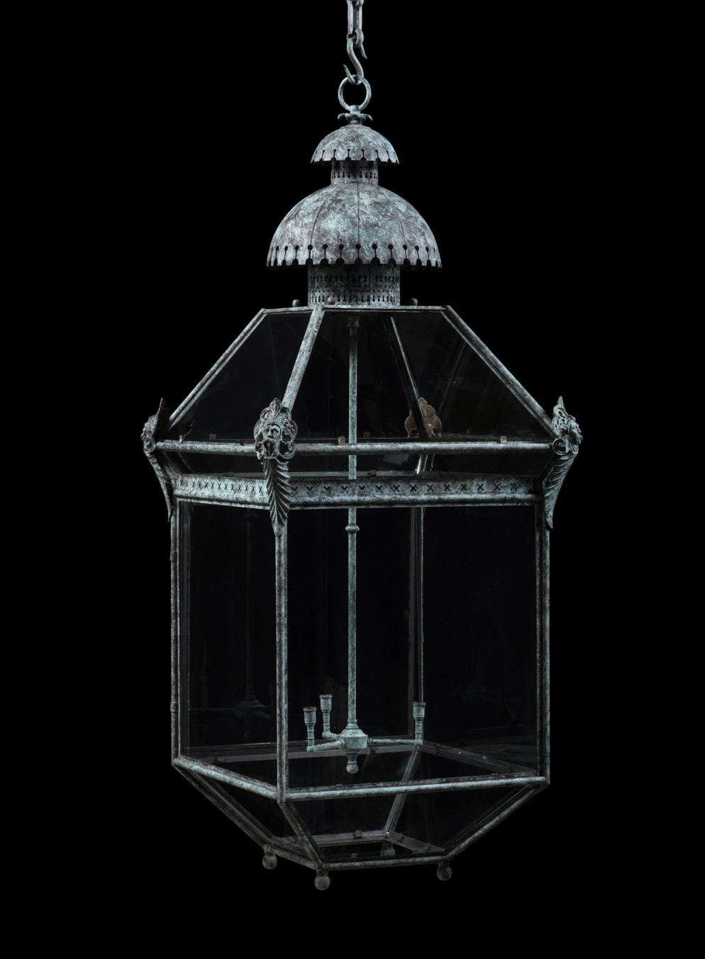 A square form, hanging lantern on a grand scale with canted and glazed upper and lower sections. Each upper corner has cast mounts beneath a double domed smoke stack with pierced collars.