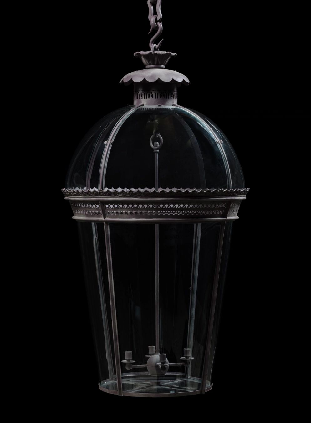 The graceful arched and glazed top with the petal shaped smoke outlet above the pierced filigree work and tapered sides makes this grand scale lantern both elegant and functional.