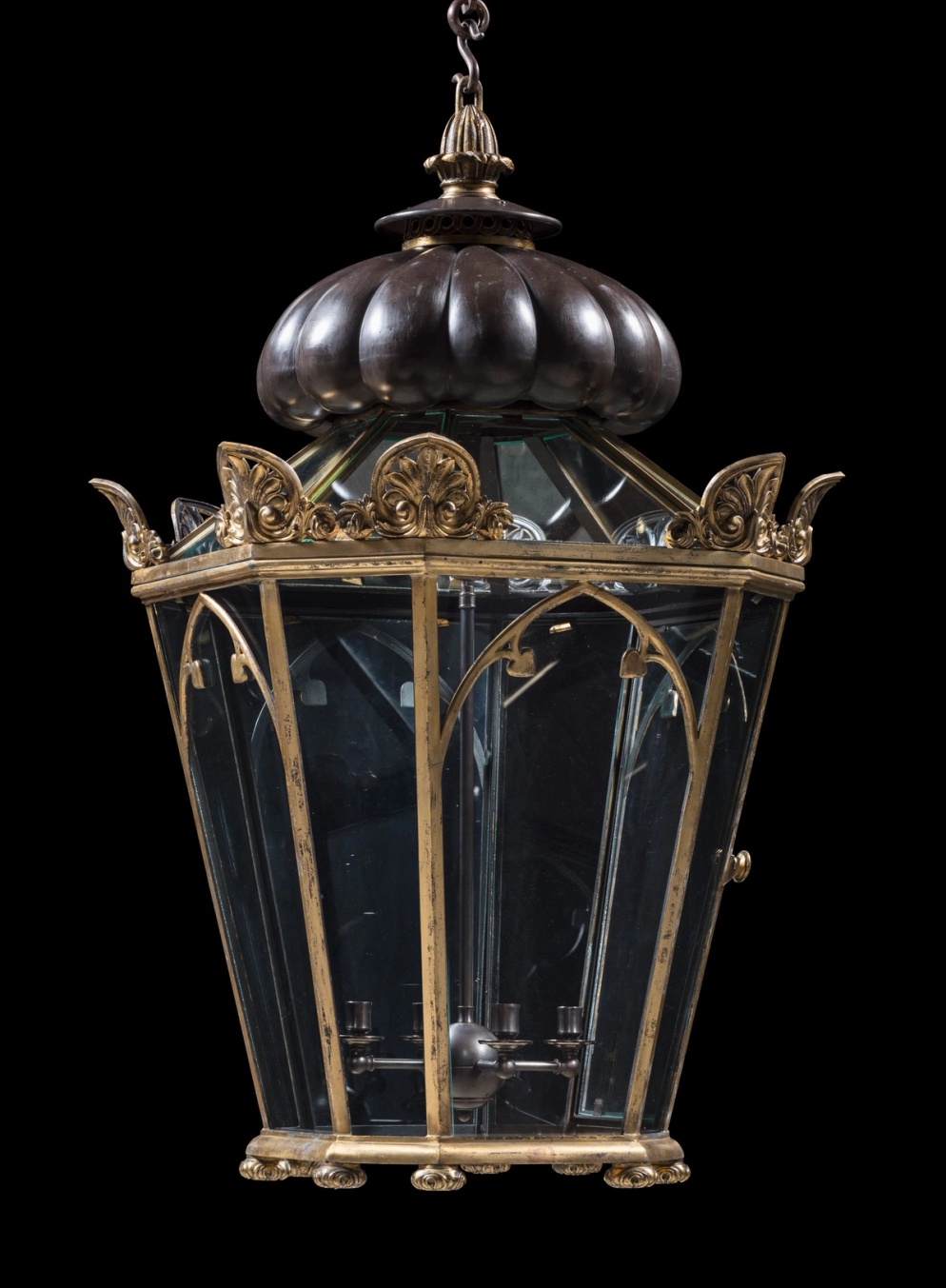 A Regency style hanging lantern with faceted, Gothic panels topped with hipped, anthemion decorated, classical antefixes; the hole upheld by a circular, rounded and ribbed clasp, capped with a finial.