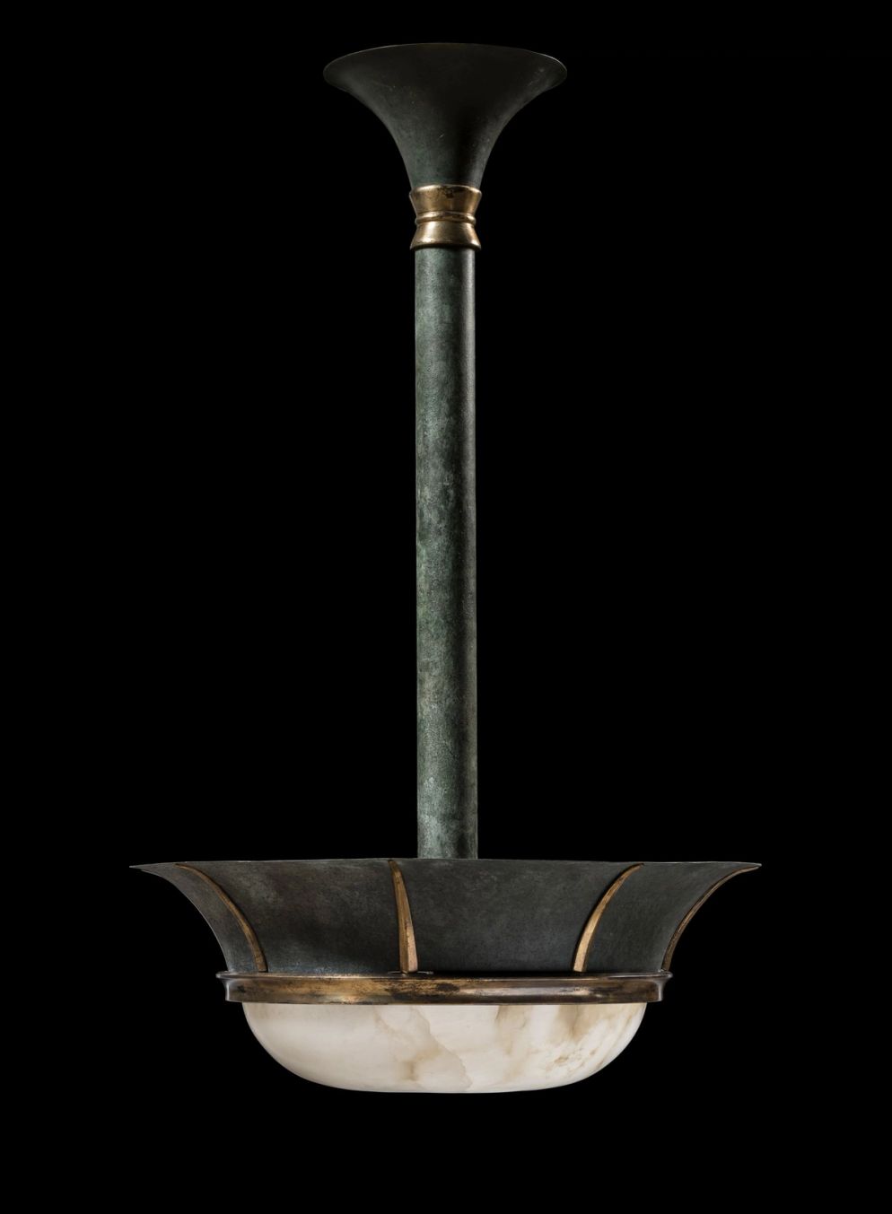 A muscular, Deco-inspired fixture of good scale and presence, both downlighting through the alabaster bowl and uplighting the stark, graceful rod that leads to the ceiling.