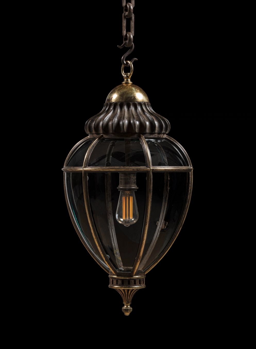 The Langtry is defined by its ovoid glass body, enclosed within a delicately structured framework of extruded brass straps and a single encircling band. The form is crowned by a domed, boldly gadrooned canopy - its scalloped surface recalling classical metalwork and early gasoliers. A pierced finial completes the silhouette with architectural precision. Shown in the Letchworth finish with distressed gilt highlights - a time-softened bronze gently lifted by touches of gold.
