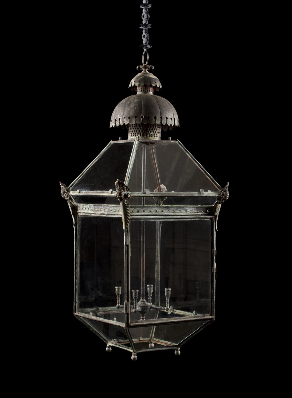 A square form, hanging lantern with canted and glazed upper and lower sections. Each upper corner has cast mounts beneath a double domed smoke stack with pierced collars.
