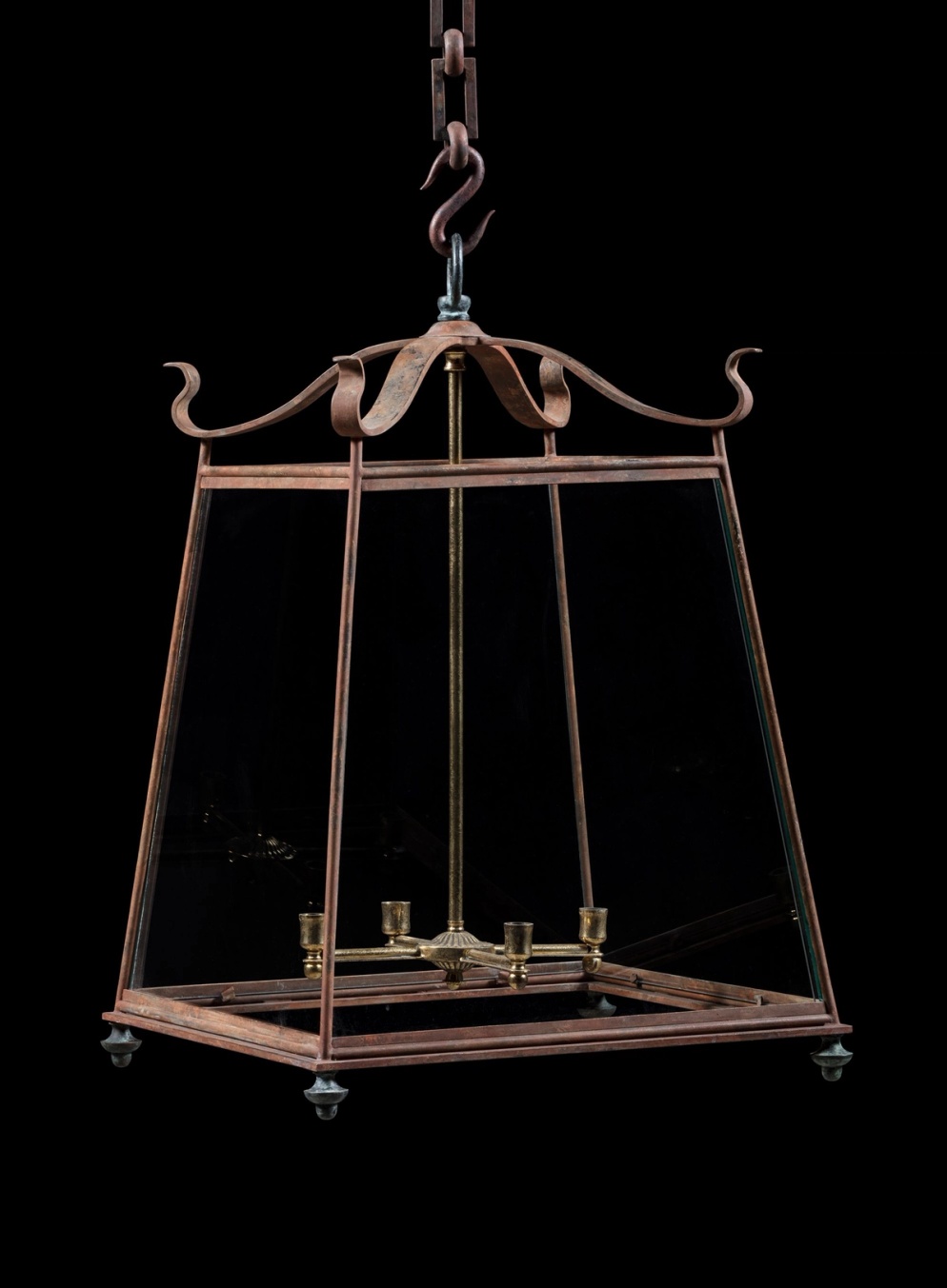 The form of this lantern unites strong, uncompromising lines of wrought iron with playful, finely drawn scrolls. Four panes of glass are held by cords of iron that lead down to turned feet. feet.