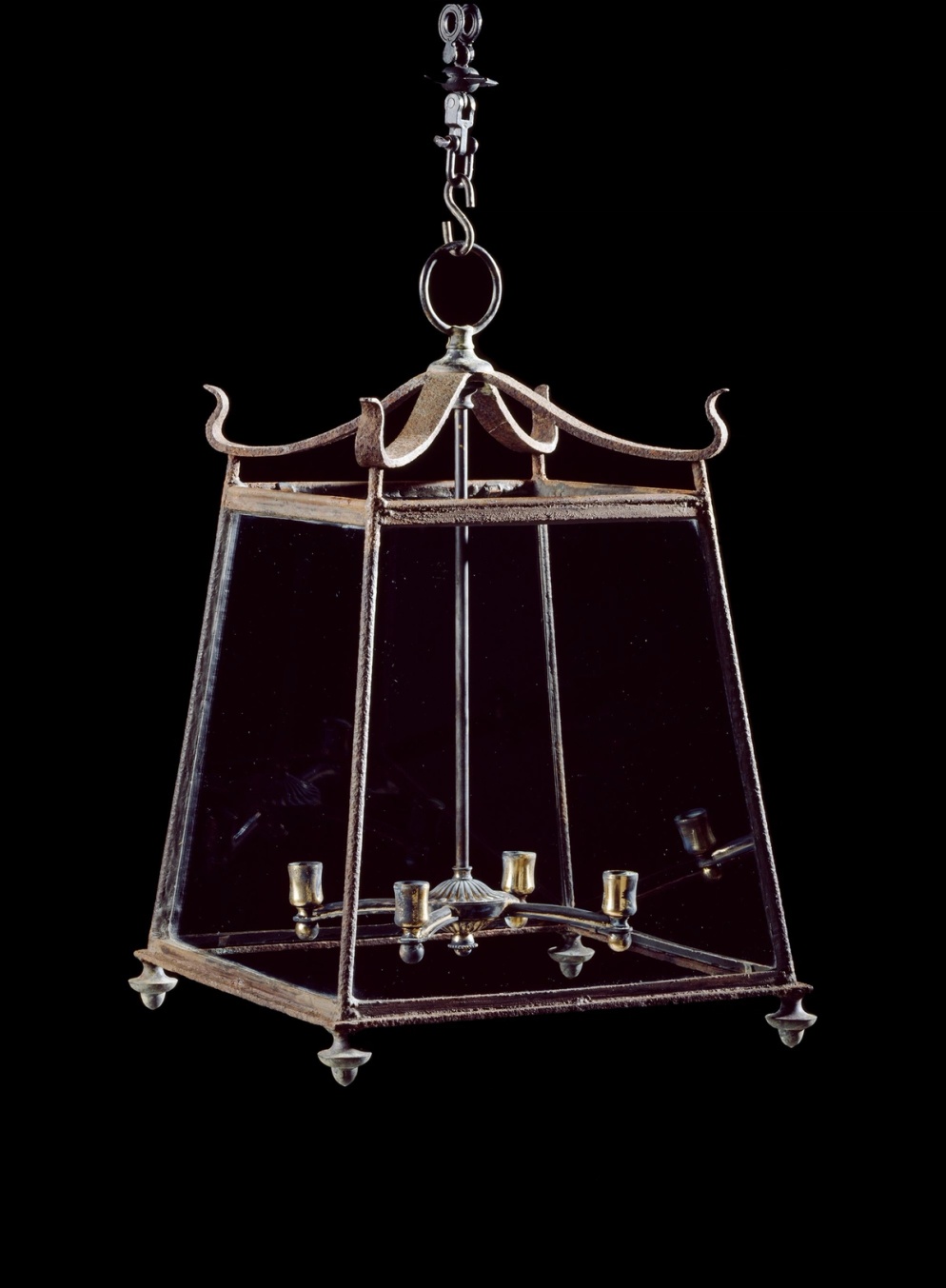 Supported by four delicate scrolls and a ring, this wrought iron hanging lantern is elegantly splayed down to the turned feet.