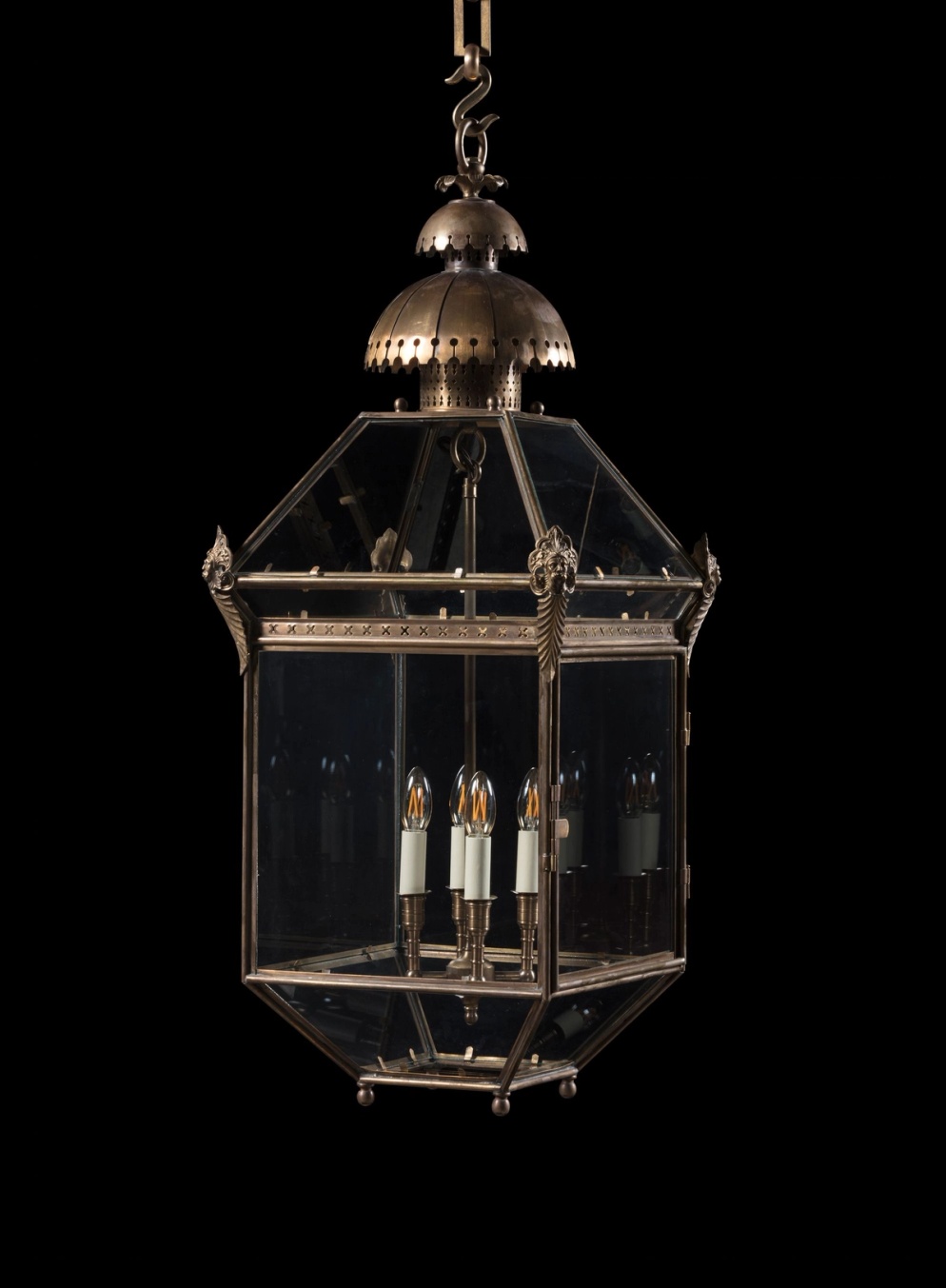 A square form, hanging lantern with canted and glazed upper and lower sections. Each upper corner has cast mounts beneath a double-domed smoke stack with pierced collars.