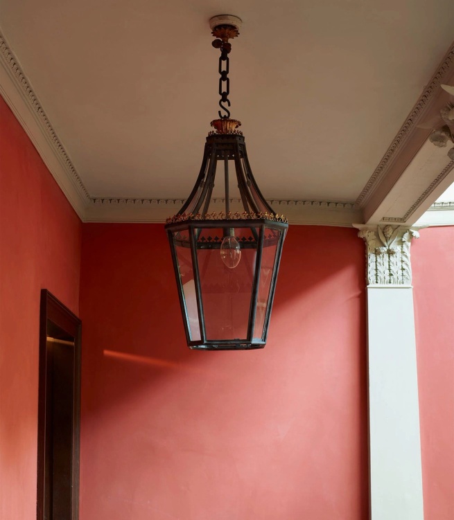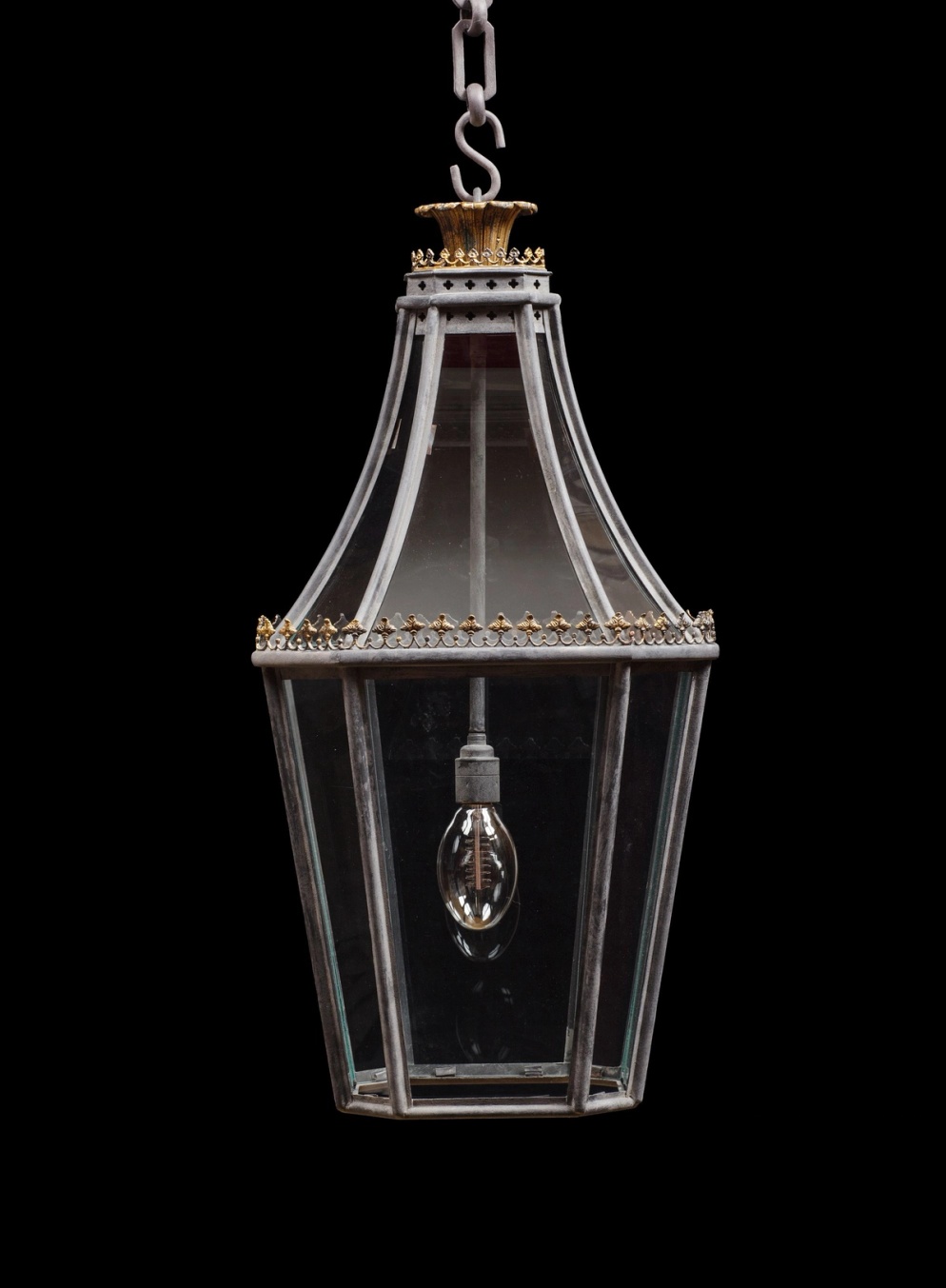 This highly unusual tapered and moulded hanging lantern is decorated with a delicate pierced gallery around both the central partition and the top, which is capped by a floral cupola.