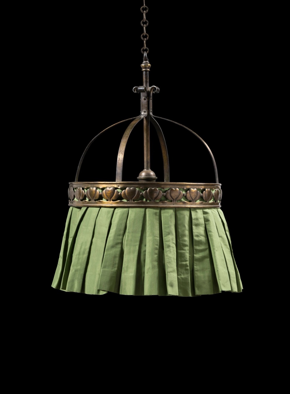 A skirt of fabric falls from a cast band of aged brass, its repeating heart motif recalling the stylized patterns of C.F.A. Voysey. The Sackville draws on the Deco movement’s fascination with bold ornament and rich materiality, uniting structure with fluidity.