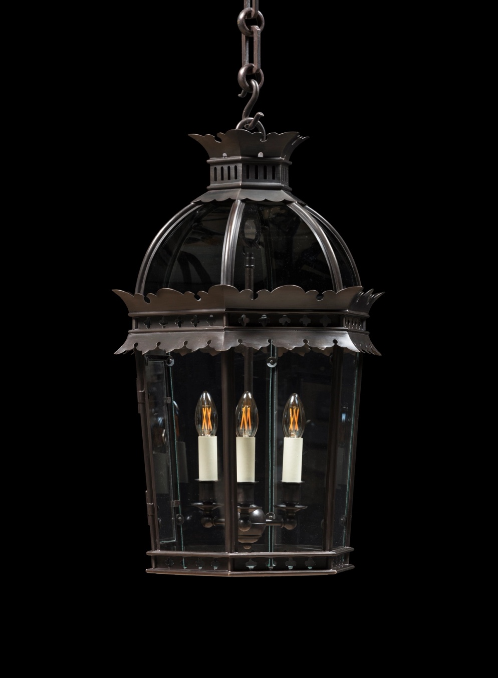 This tapered and moulded lantern features a glazed domed top beneath a slotted cupola, with a hinged side door and a pierced frieze of Gothic and Jacobean revival ornament. Shown in Brown Bronze with distressed gilt highlights.