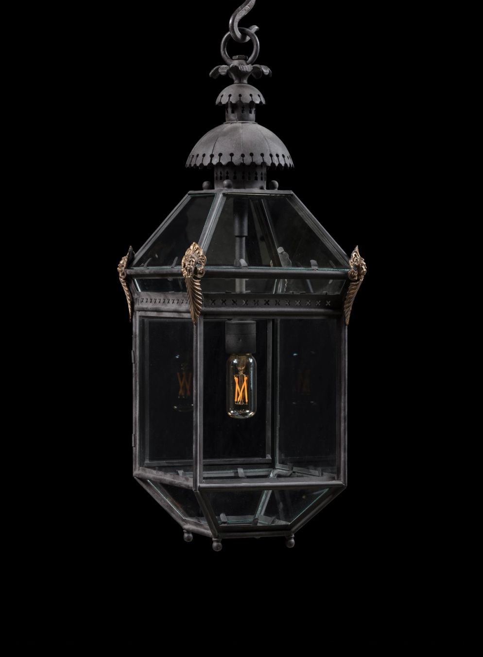 A square form, hanging lantern with canted and glazed upper and lower sections. Each upper corner has cast mounts beneath a double-domed smoke stack with pierced collars.