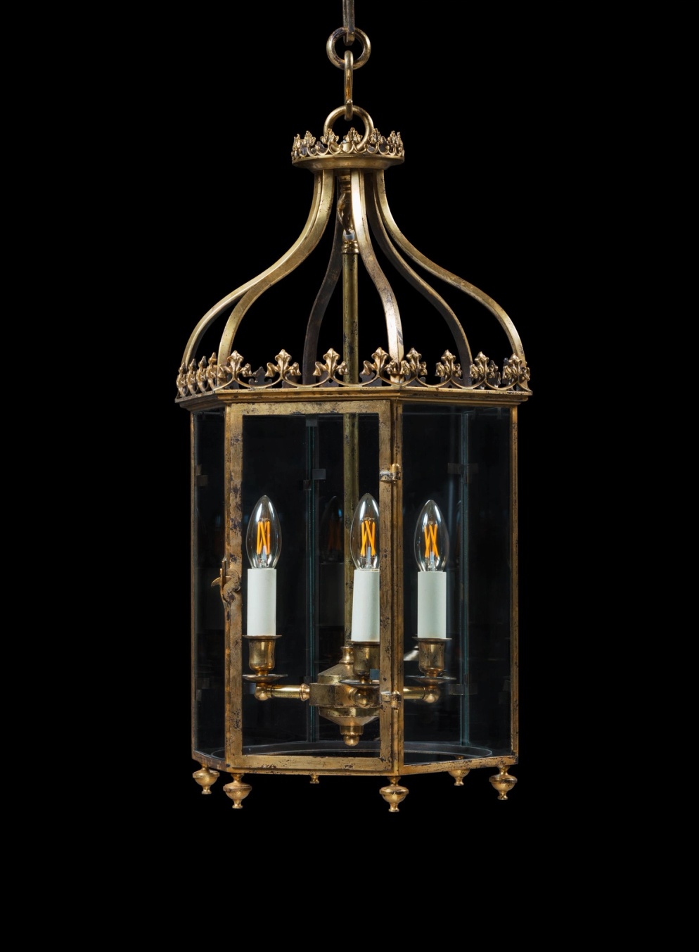 A compact hexagonal lantern in the George IV Gothic style with curved upper supports terminating in a crown of finely wrought trefoil. Above the glass panes is further trefoil ornamentation, this time larger, the trefoil theme running throughout the lantern like faded fleur-de-lis. Beneath the lantern, the six points of the hexagon are embellished by turned finials. Shown here, is the Smallest Selwyn lantern we make, the three-arm candelabra of pleasingly modest proportions.