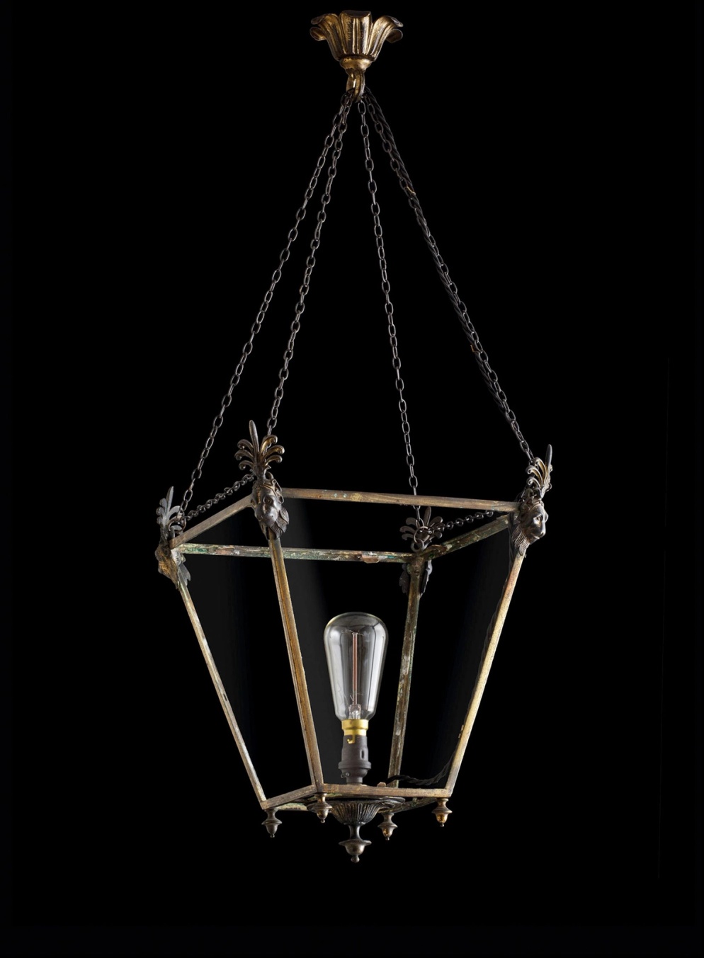 This elegant hanging lantern has tapering sides the corners of which are surmounted by female Egyptian lions masks capped with anthemion fronds, and is upheld by four chains hanging from a ceiling rose, the underneath is decorated with inverted finials.