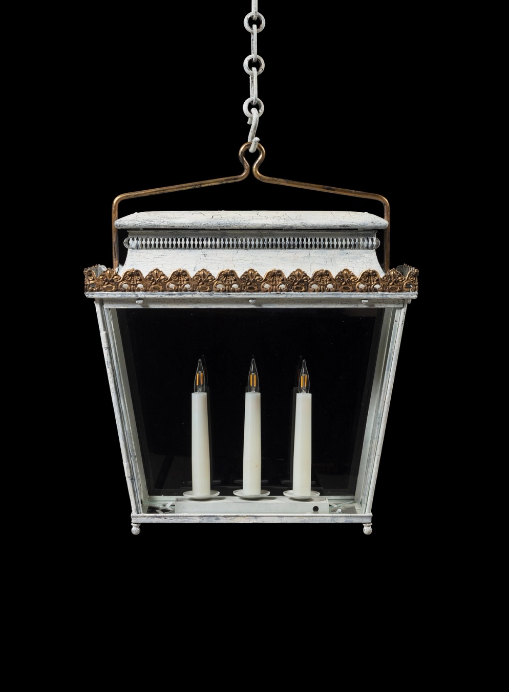 Well suited to placement above a kitchen counter, dining table, or in an entrance hall, the Whitmore is a generously scaled hanging lantern with finely balanced proportions. It is crowned with a pierced frieze of stylised anthemion cresting, and finished with a vented chimney band and a boldly looped suspension hook in distressed gilt. Inside, three taper candles sit within a glazed frame raised on discreet bun feet, providing ample illumination.