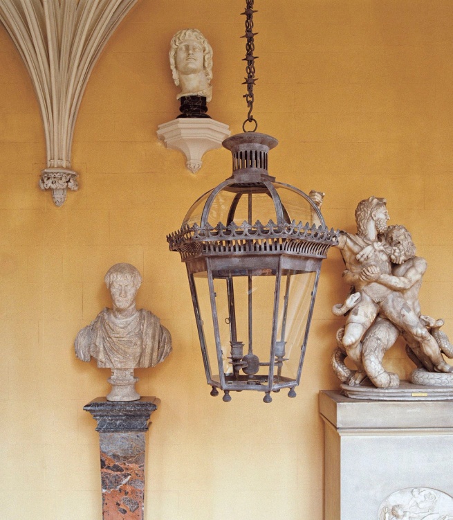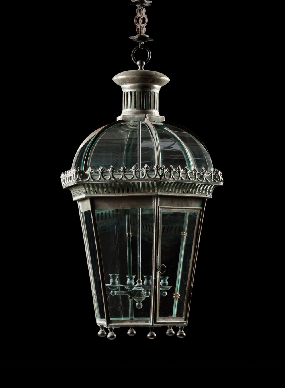 This tapered and moulded lantern has a hinged side door on bun feet beneath a running band of piercing, and a glazed and domed top with a slotted cupola.