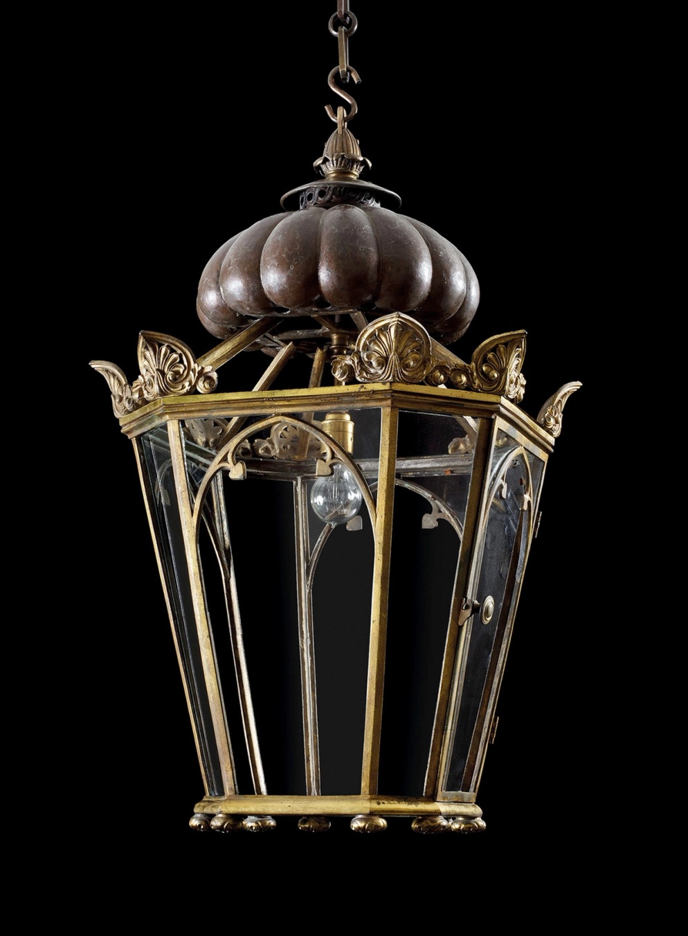 A Regency style hanging lantern with faceted, Gothic panels topped with hipped, anthemion decorated, classical antefixes; the hole upheld by a circular, rounded and ribbed clasp, capped with a finial.