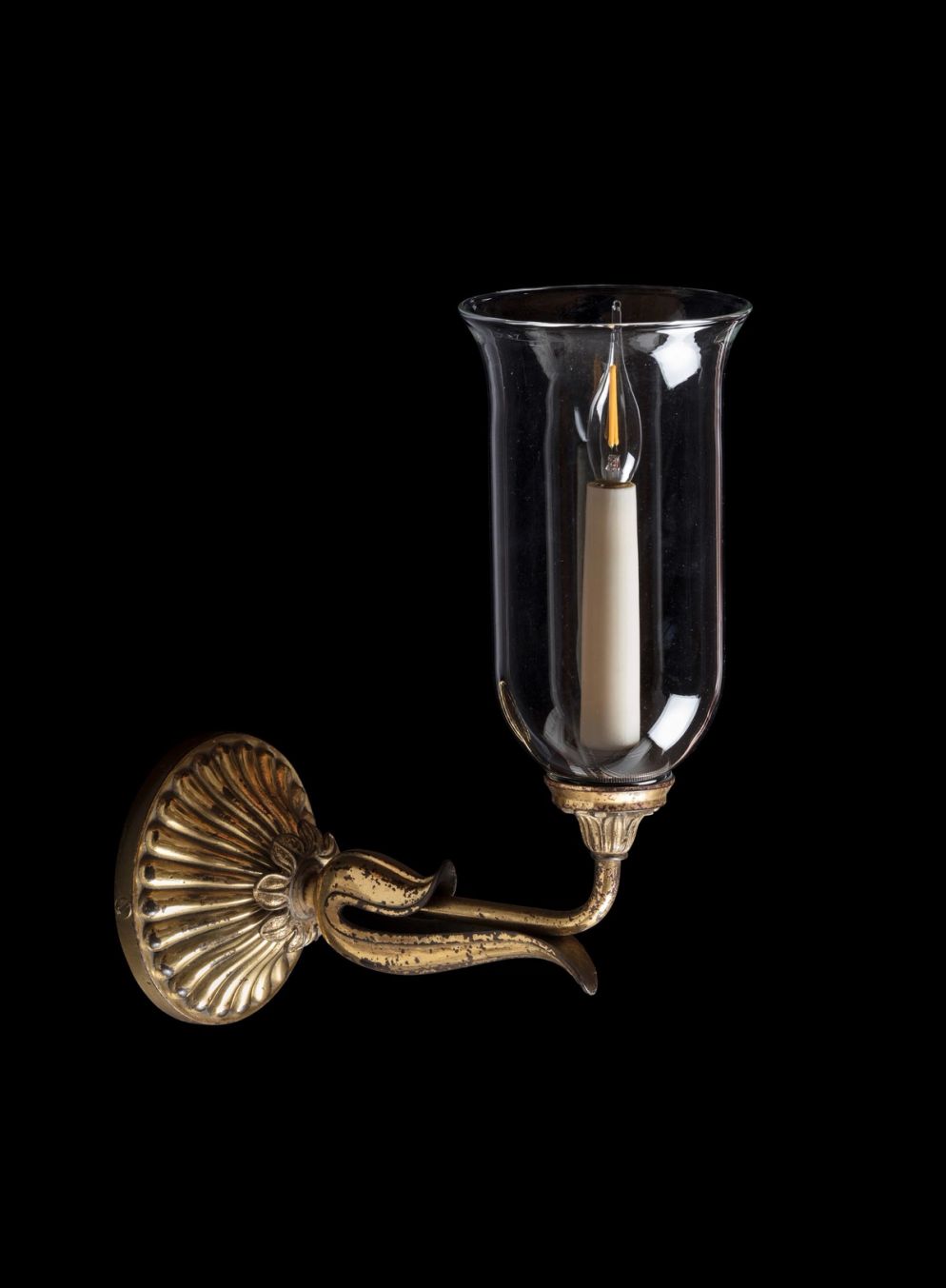 The lotus flower design of this wall light evokes a central motif of Egyptian, and later Roman, design. The gadrooned circular base, as it leads up to the stem, folds back into distressed gilt sepals and an upturned, clear glass dome protects the candle. Taking inspiration from English, Regency-era Neoclassicism, this wall light evokes the world Austen and Thackeray knew; of brocade in candlelight.