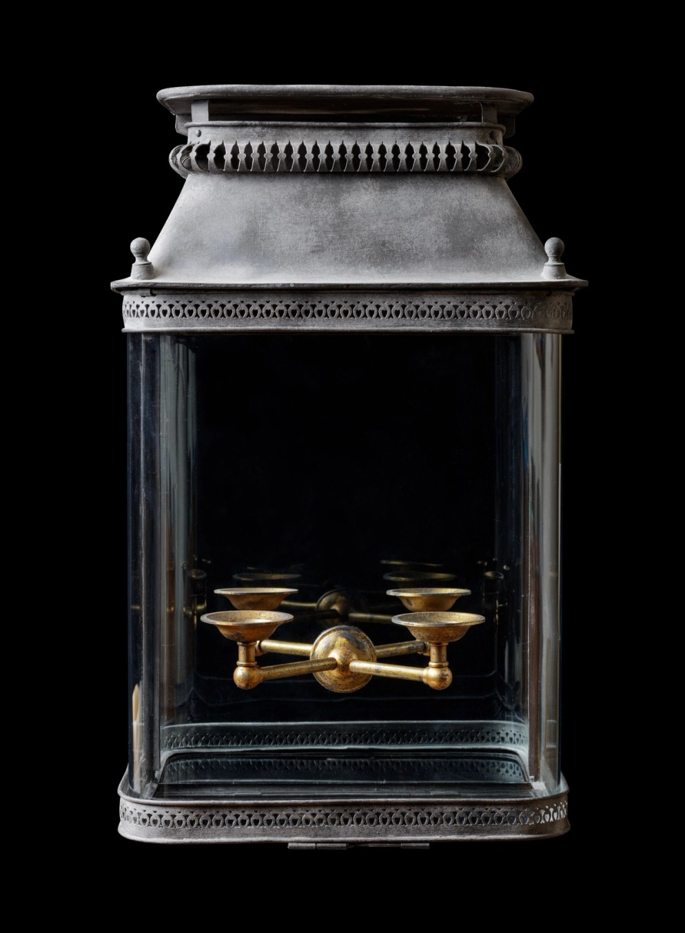 A refined and delicate pierced metal wall lantern. The curved glass fascia sits in front of a mirrored back holding a two branch interior, below a sloping roof.