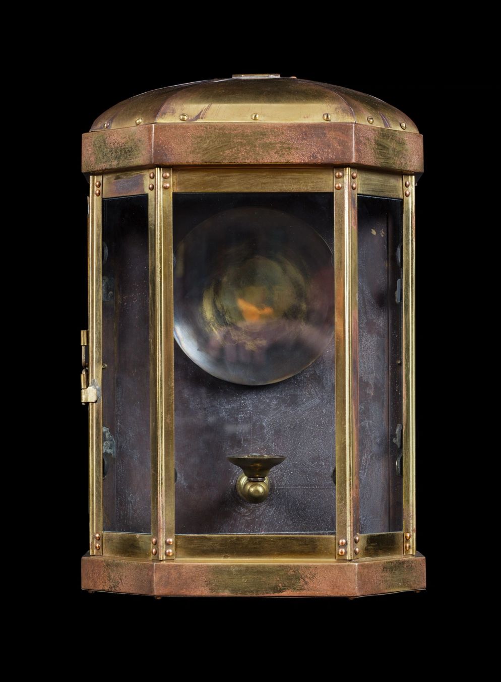 A patinated brass wall-mounted lantern with canted corners, riveted domed top and moulded sides. The back is fitted with a circular reflector and light holder above a hinged glass base.