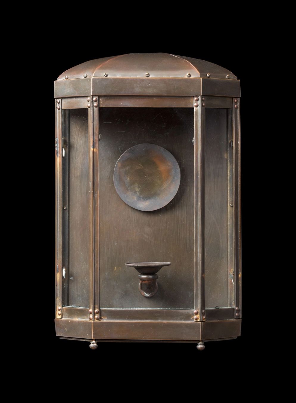 A patinated wall mounted lantern with canted corners, riveted domed top and moulded sides. The back is fitted with a circular reflector and light holder above a hinged glass base.
