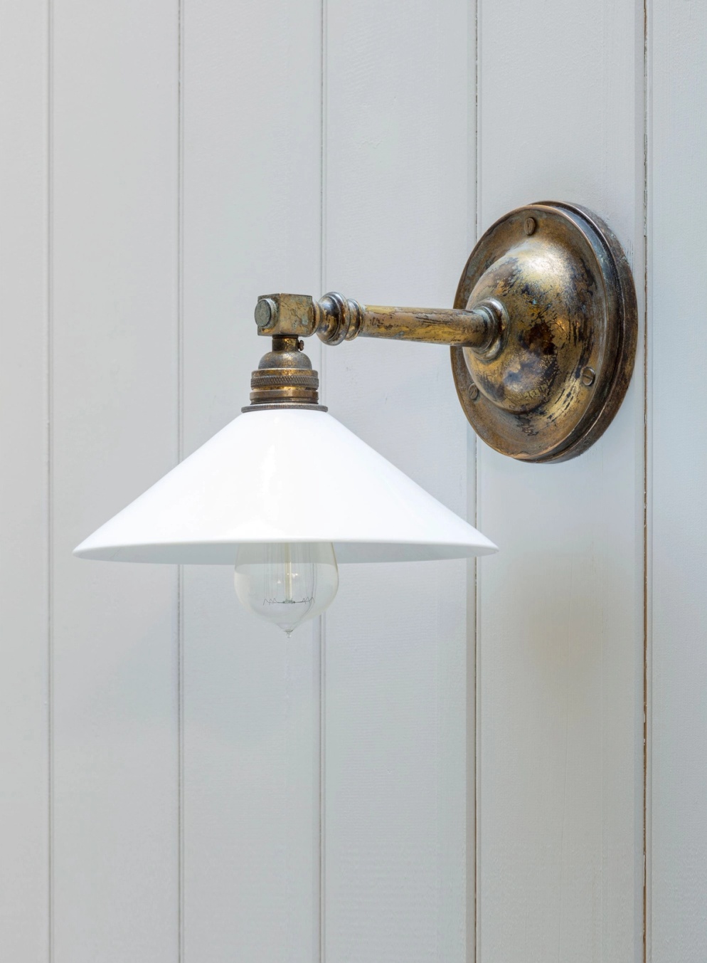 A single, chic wall light with a glass coolie shade attached to a square gimbal with decorative caps.